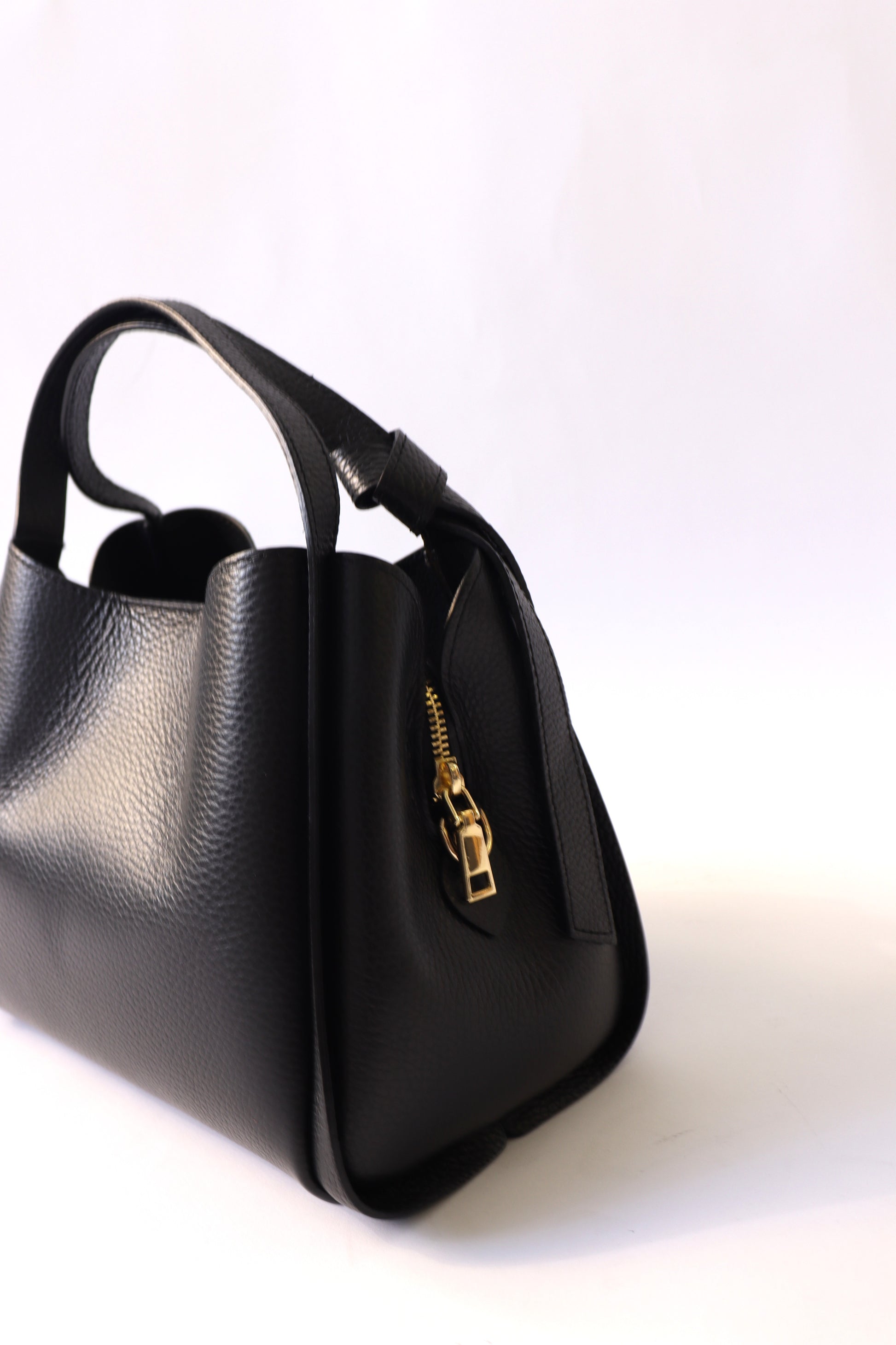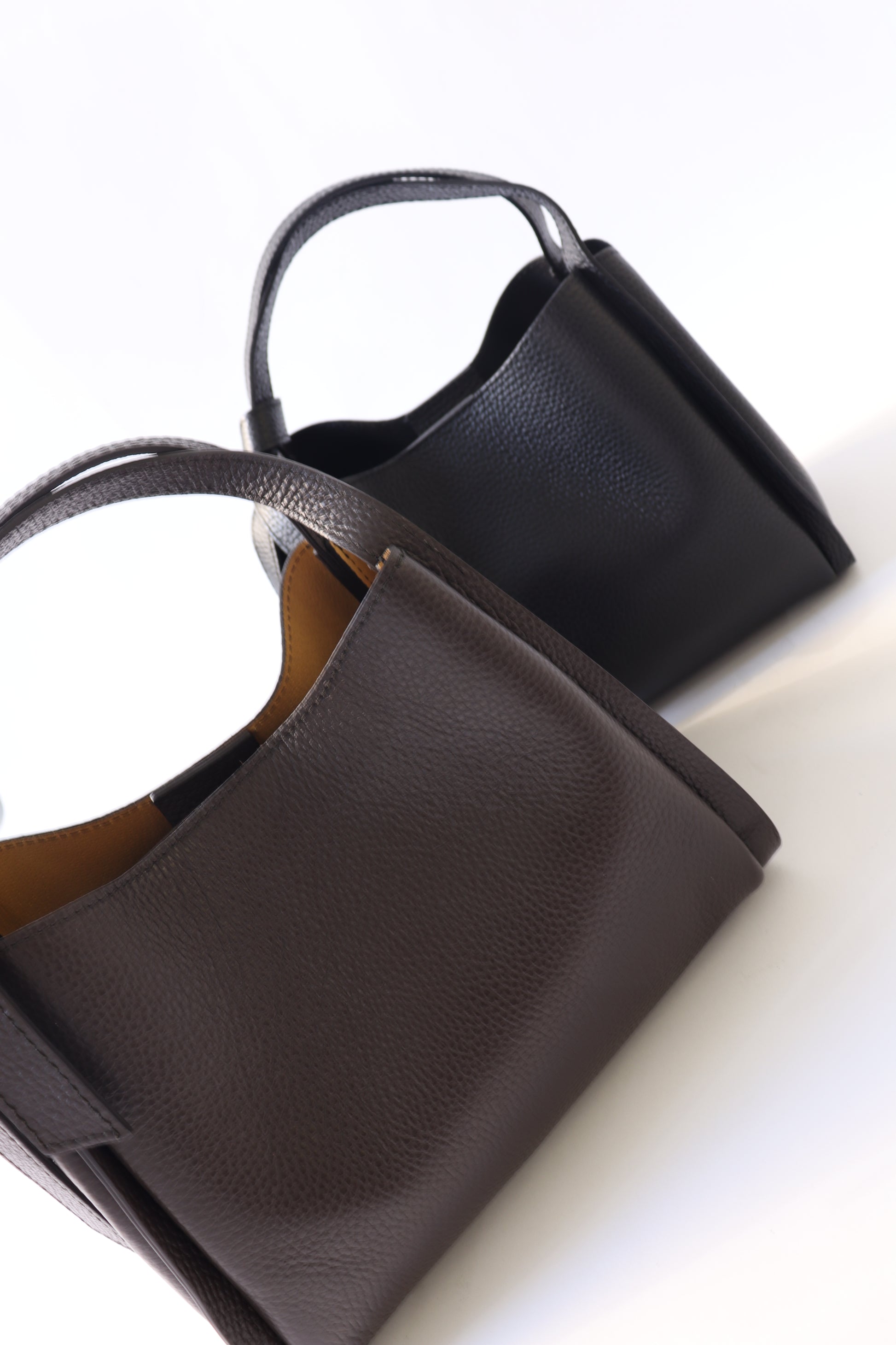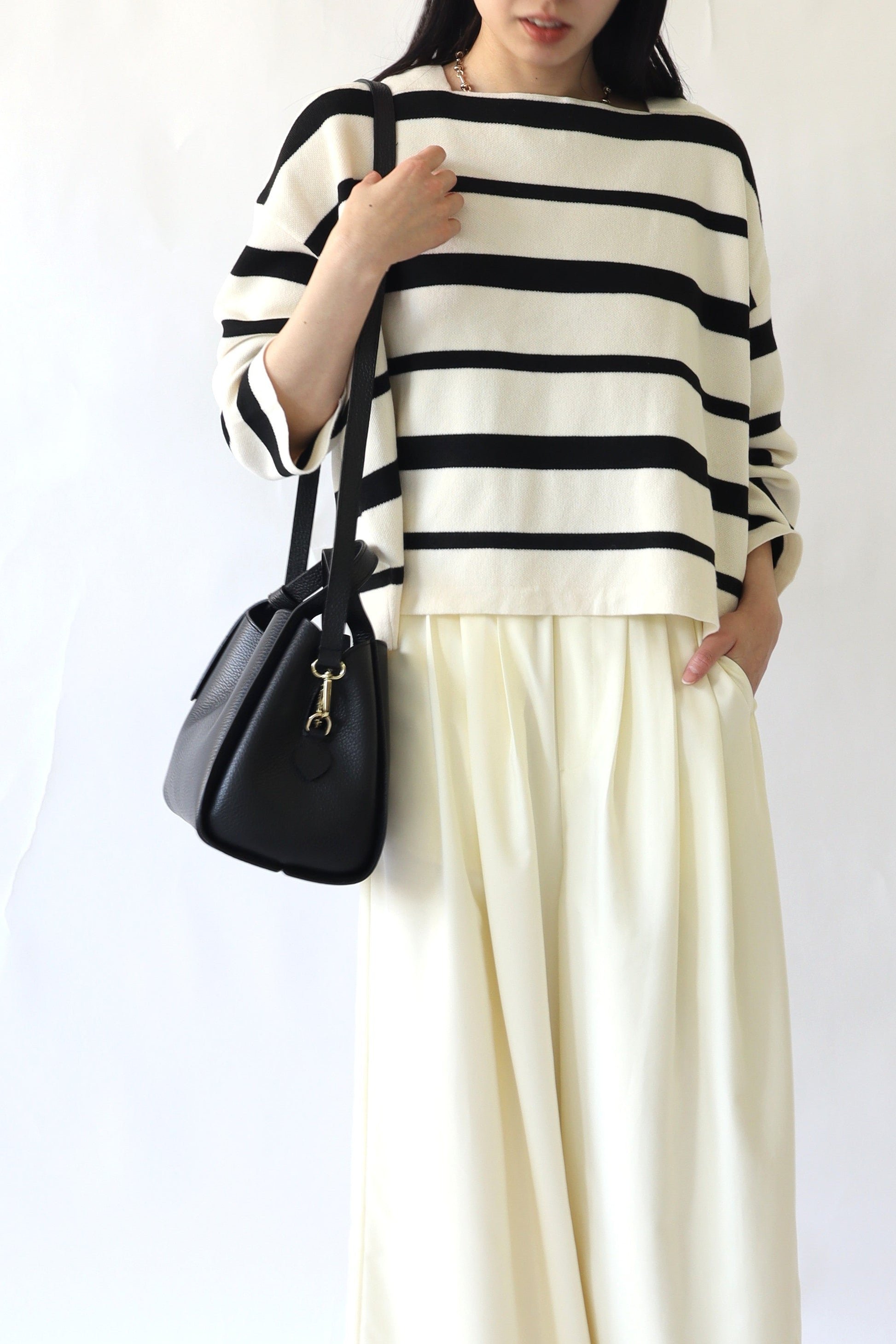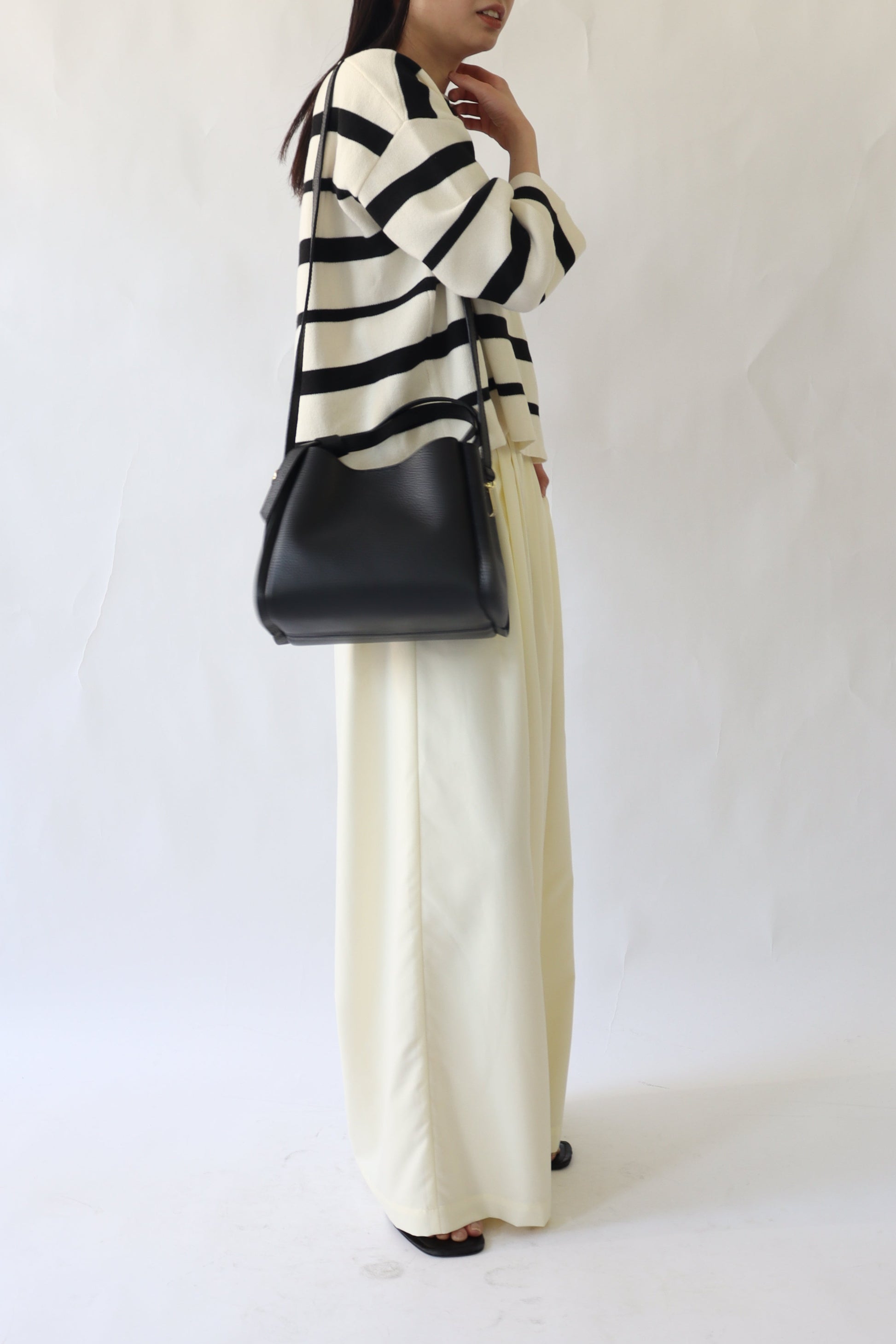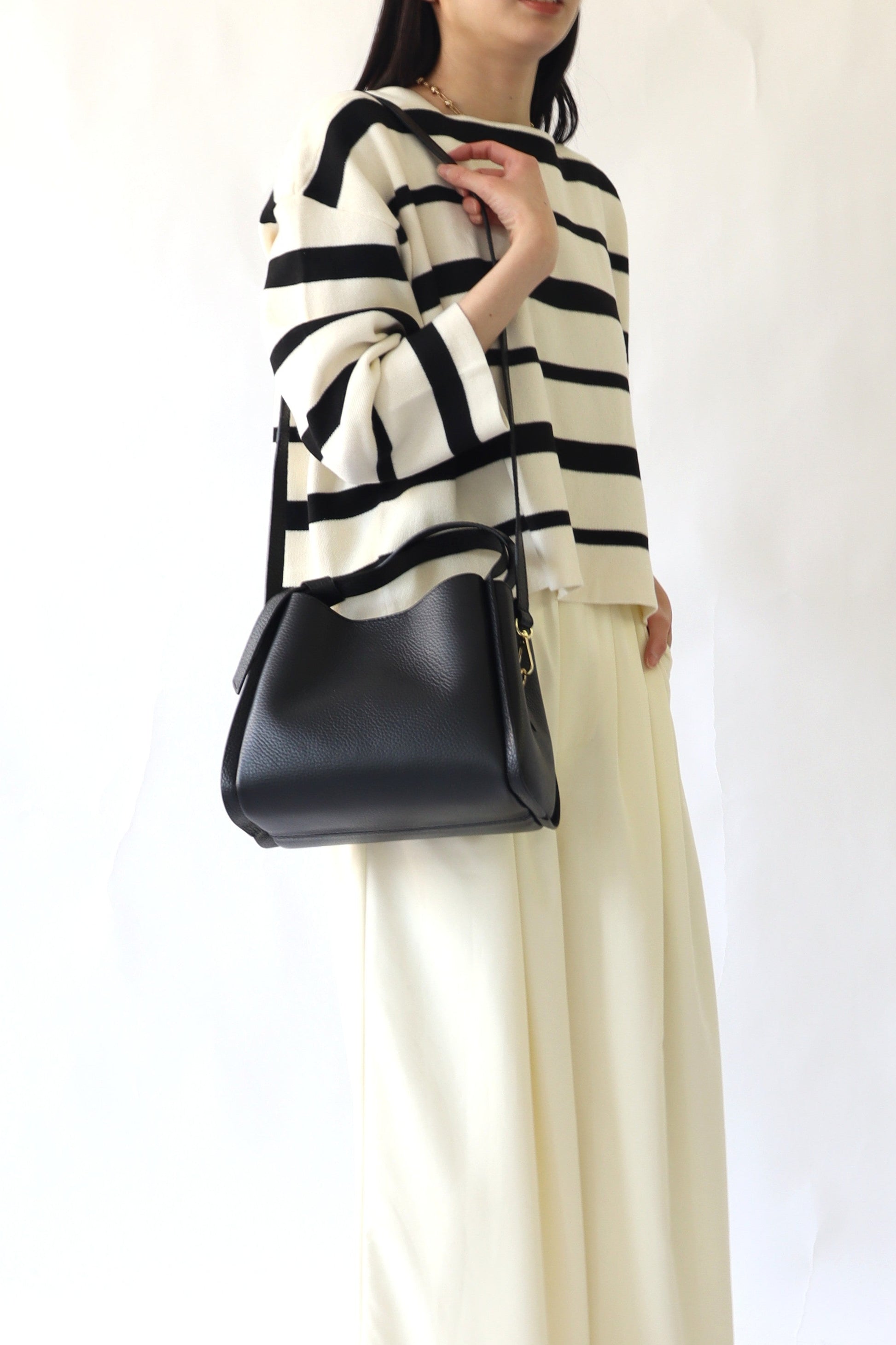 dailyに使いやすい、必要な荷物がしっかり収納できる適度なサイズ感のバッグ。ショルダーストラップ付きで、ハンドバッグとしてもショルダーバッグとしても使える2WAY仕様。ハンドル部分のノットデザインでさりげない遊び心をプラス。