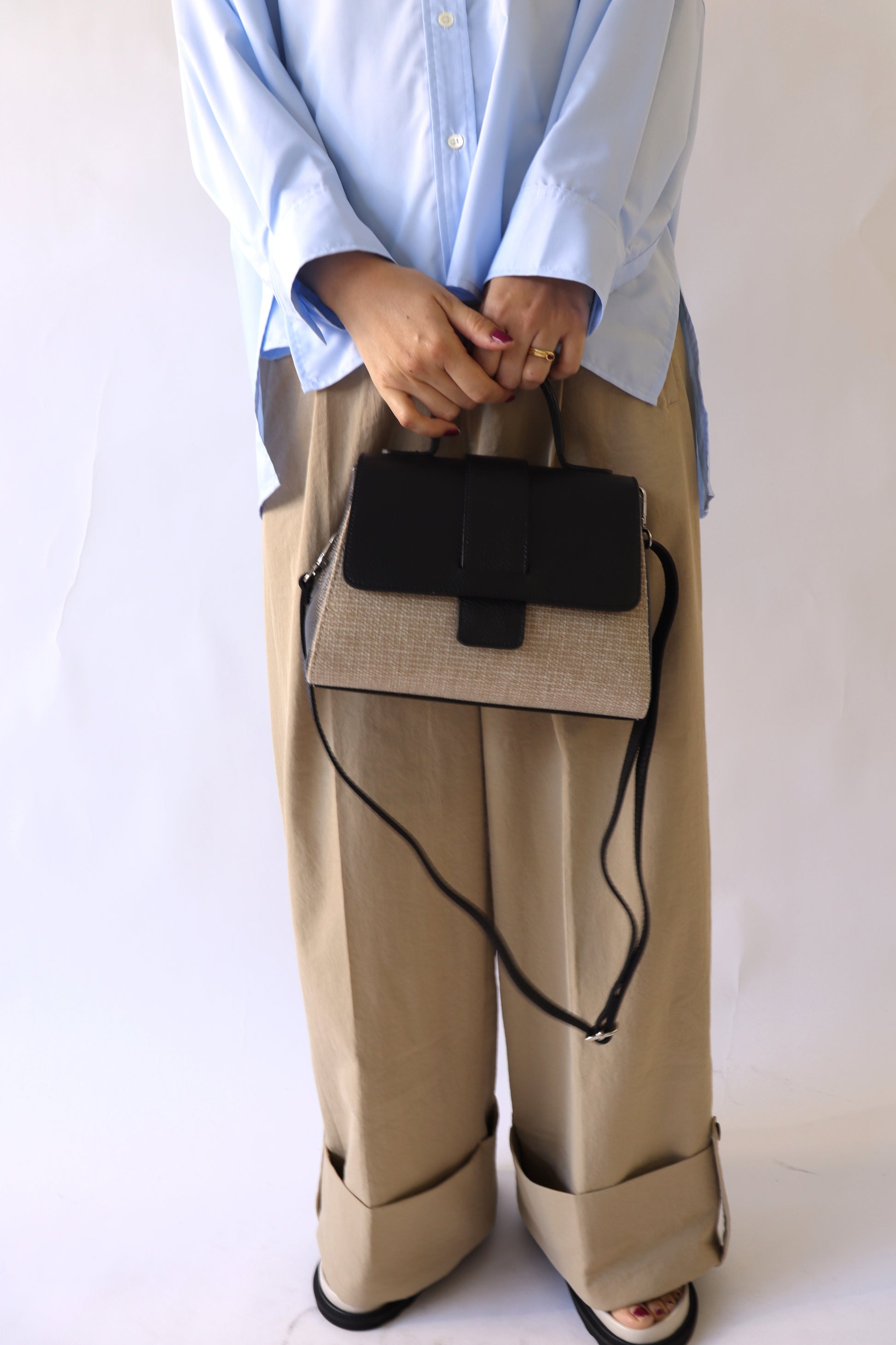 クラシックな佇まいが品のあるワンハンドルバッグ。布帛とレザーのコンビで軽やかな抜け感のある印象に。かっちりとしたフォルムが品よくスタイリングをまとめてくれます。