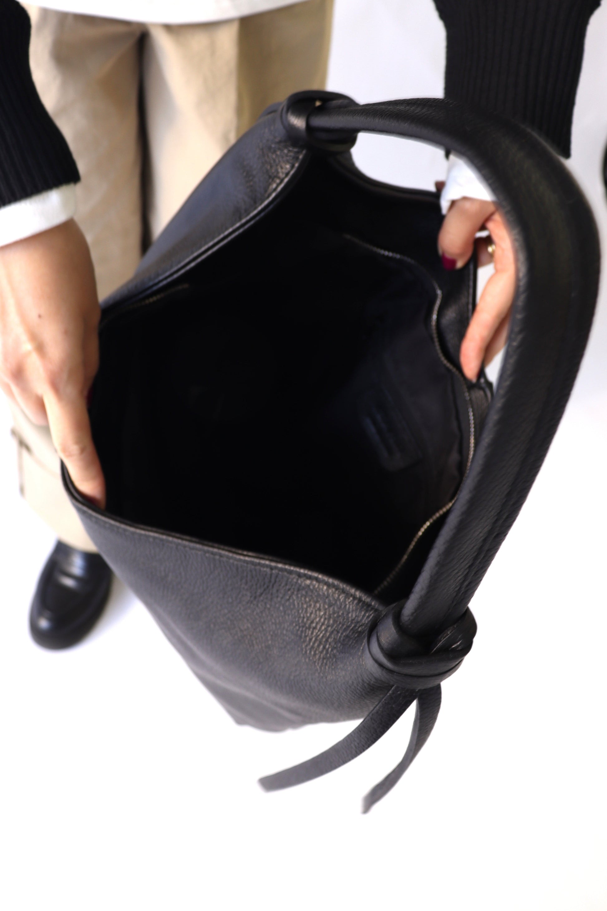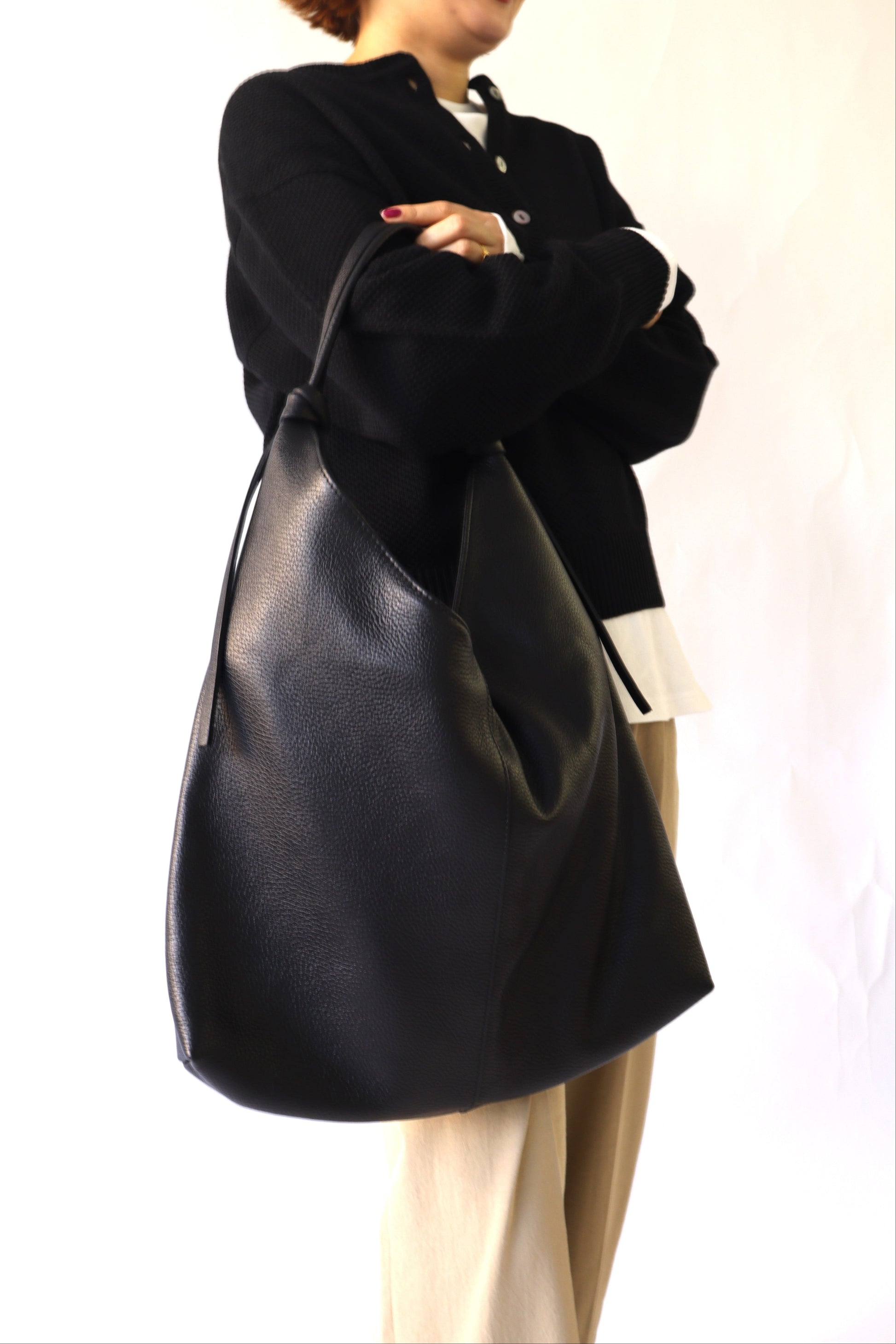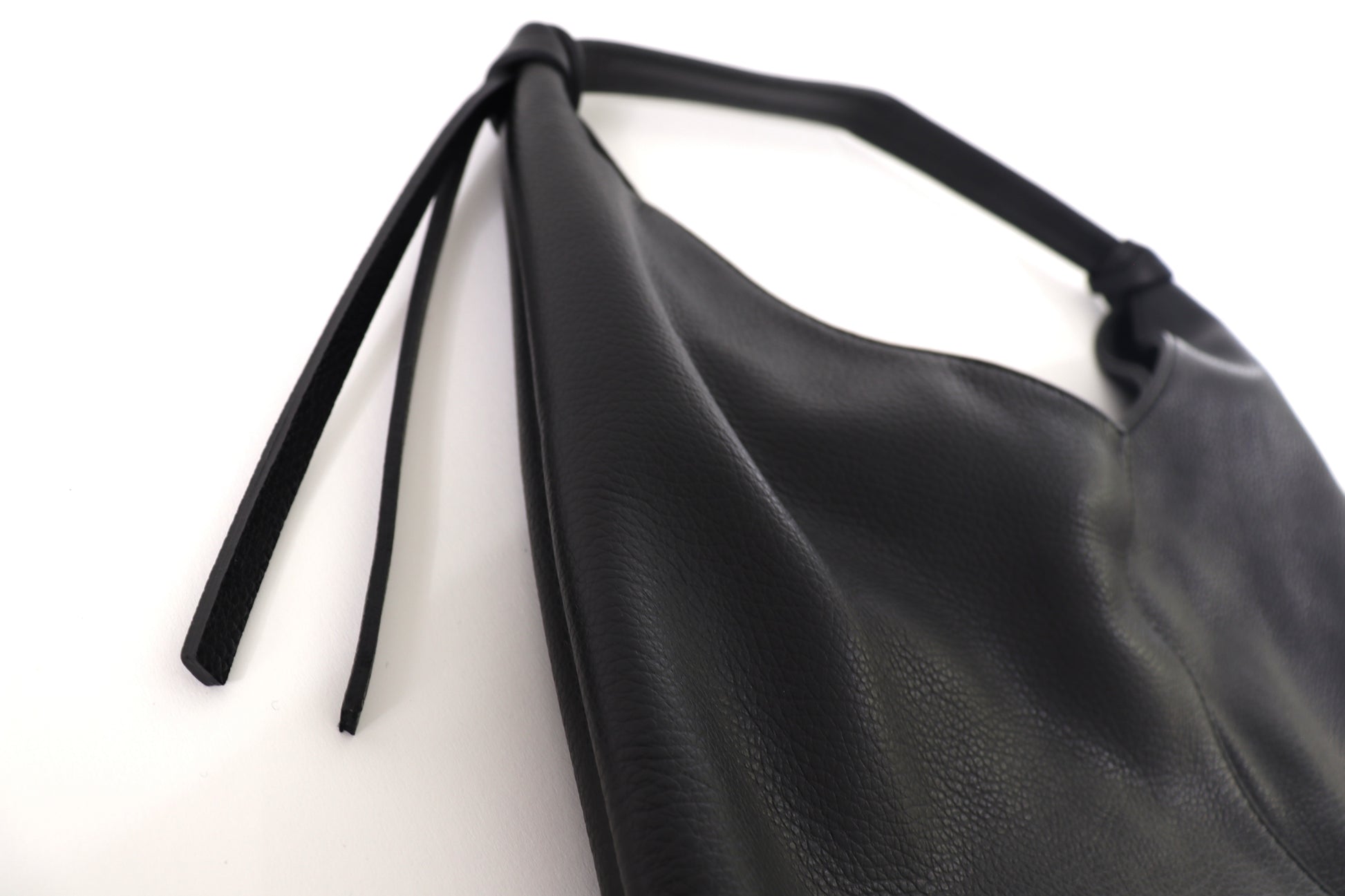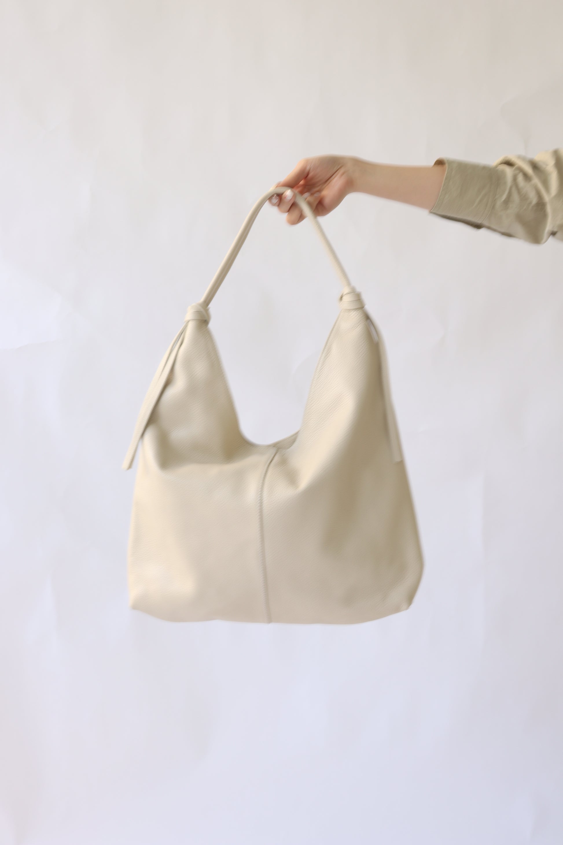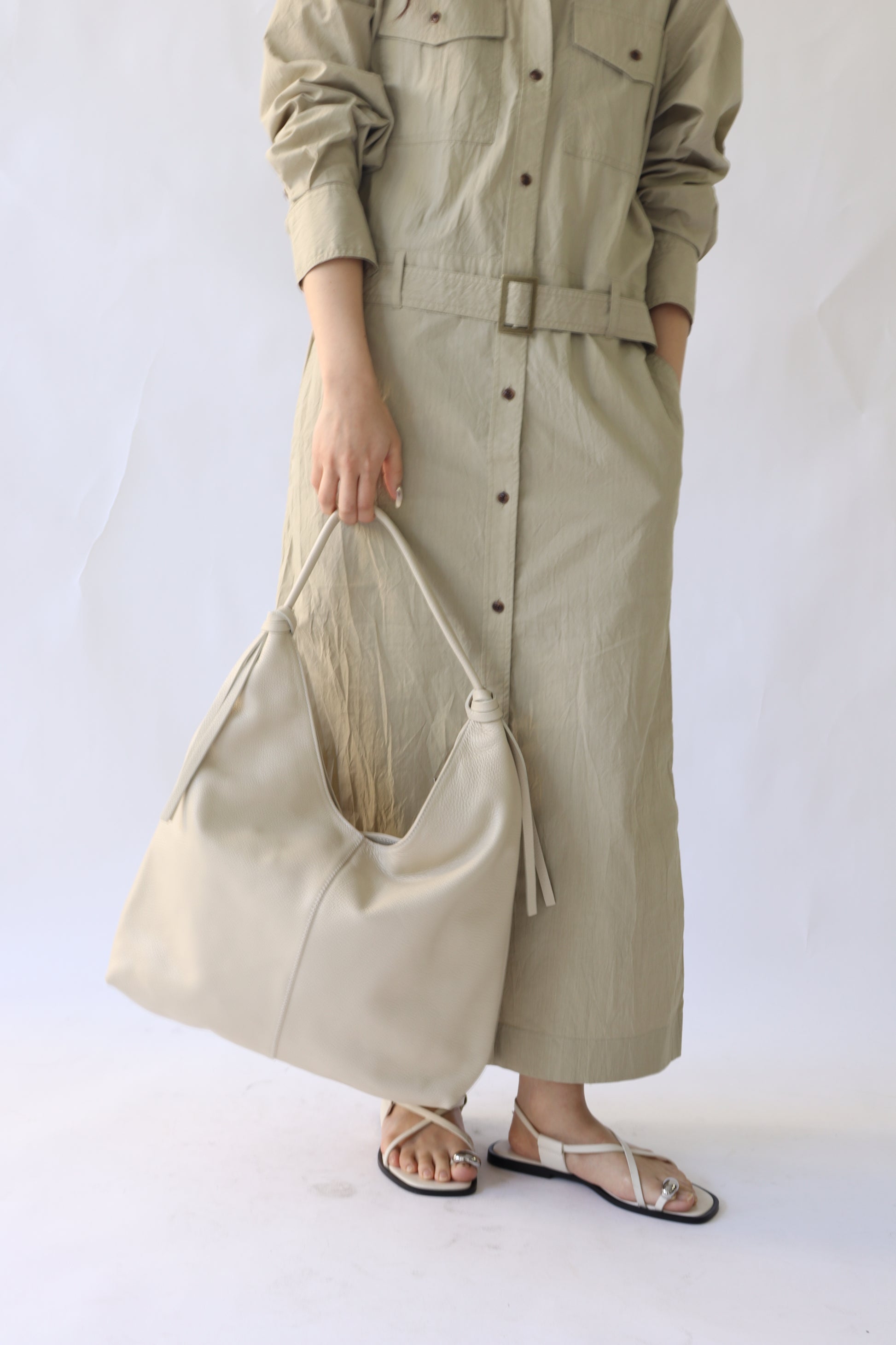 こなれたサイズ感がdailyに使いやすいホーボーバッグ。柔らかなたたずまいでコーディネートに抜け感をプラスしてくれ、どんなスタイルも邪魔をしない、長く使える万能なアイテム。持ち手のかざり紐デザインもポイントに。