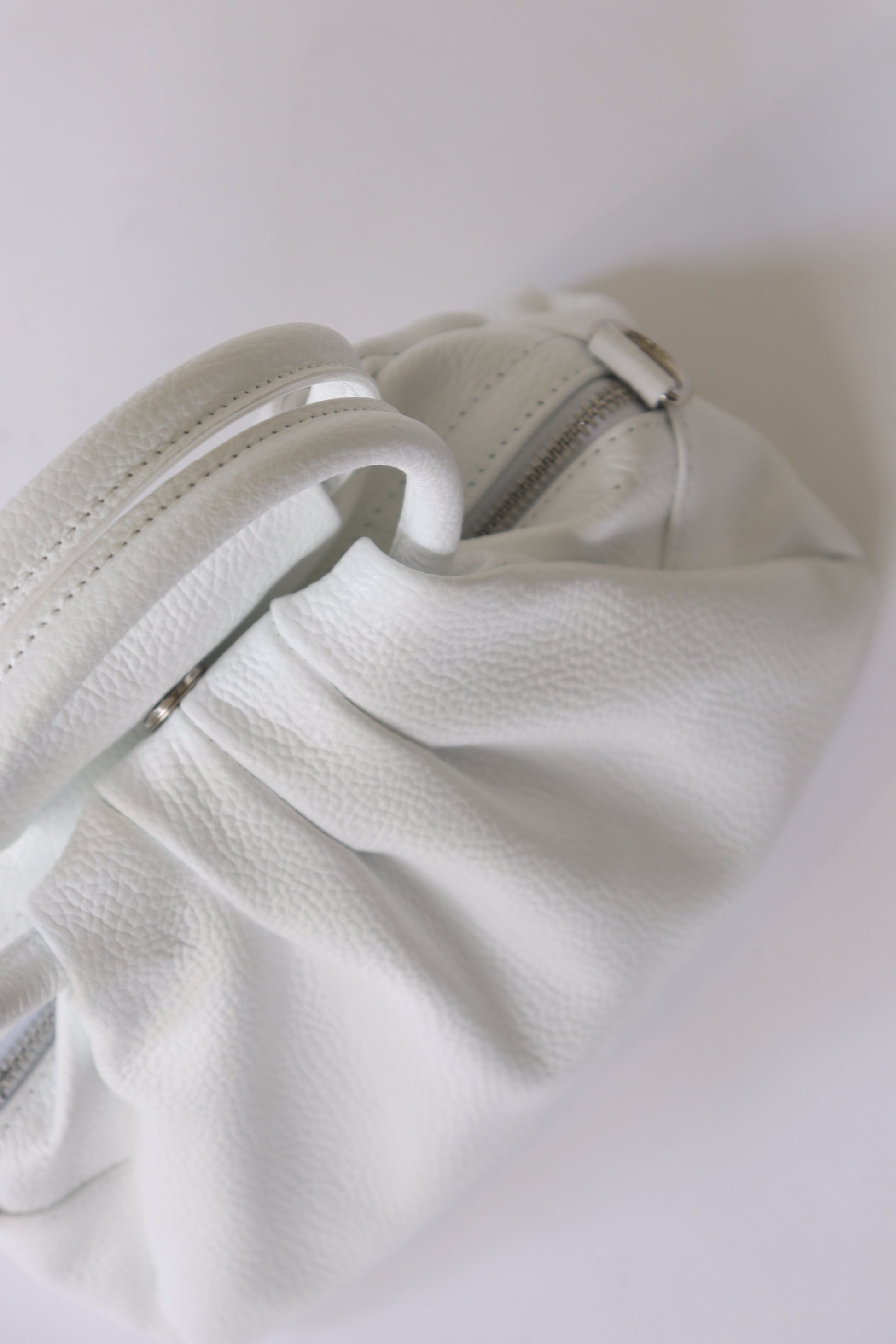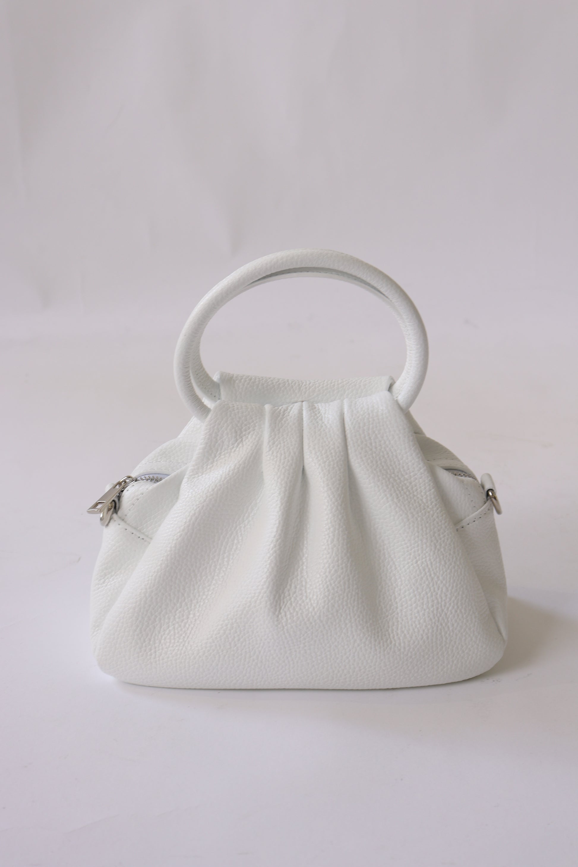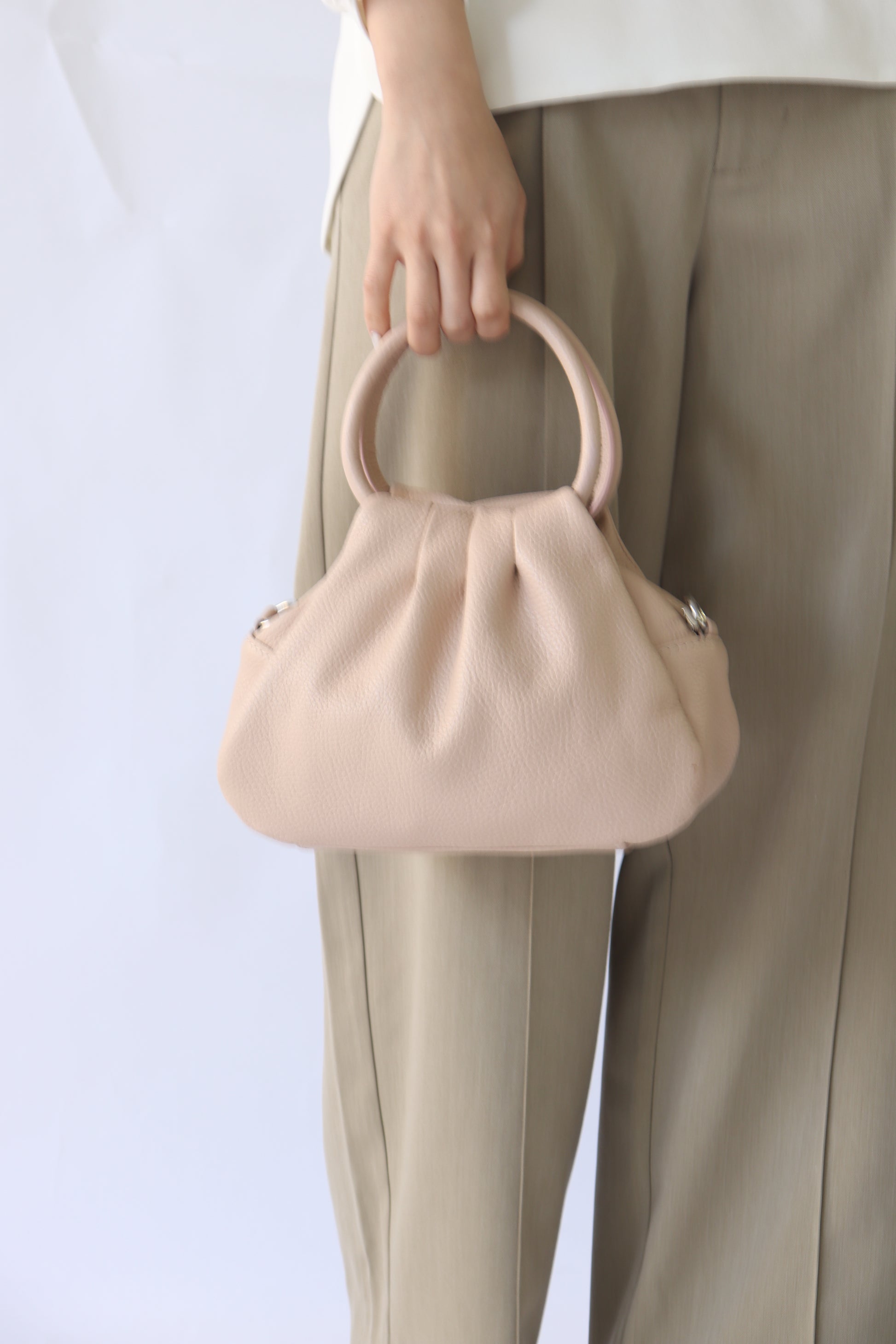 クラシックなタックを取り入れたなハンドバッグ。ふっくらとした丸みが特徴的な美しいフォルム。ファスナーとマグネット付きでしっかりと口が閉まるタイプ。