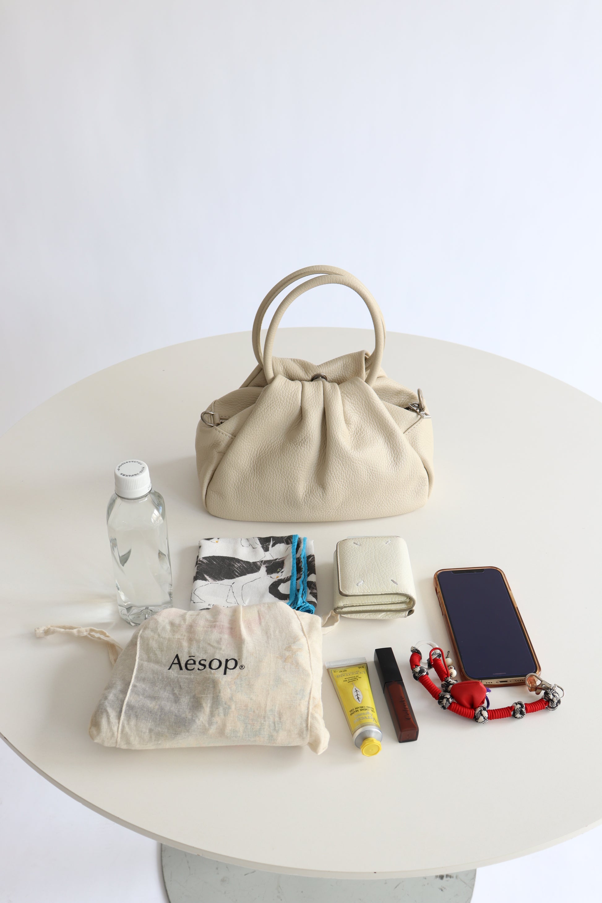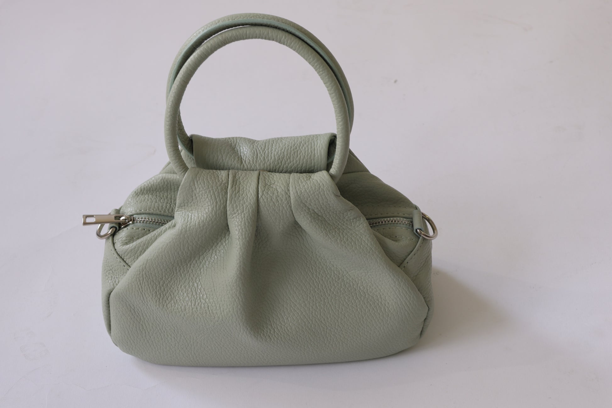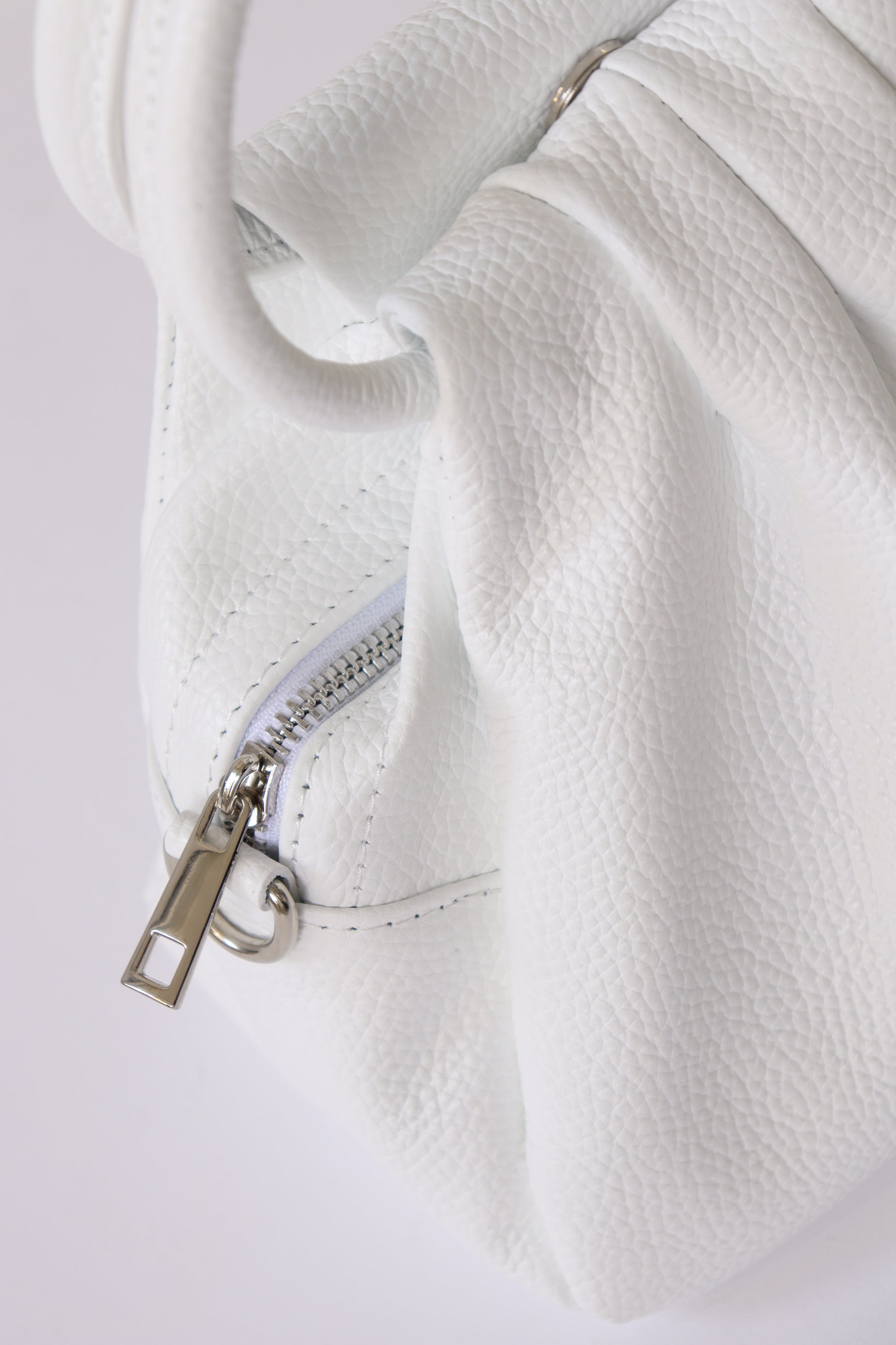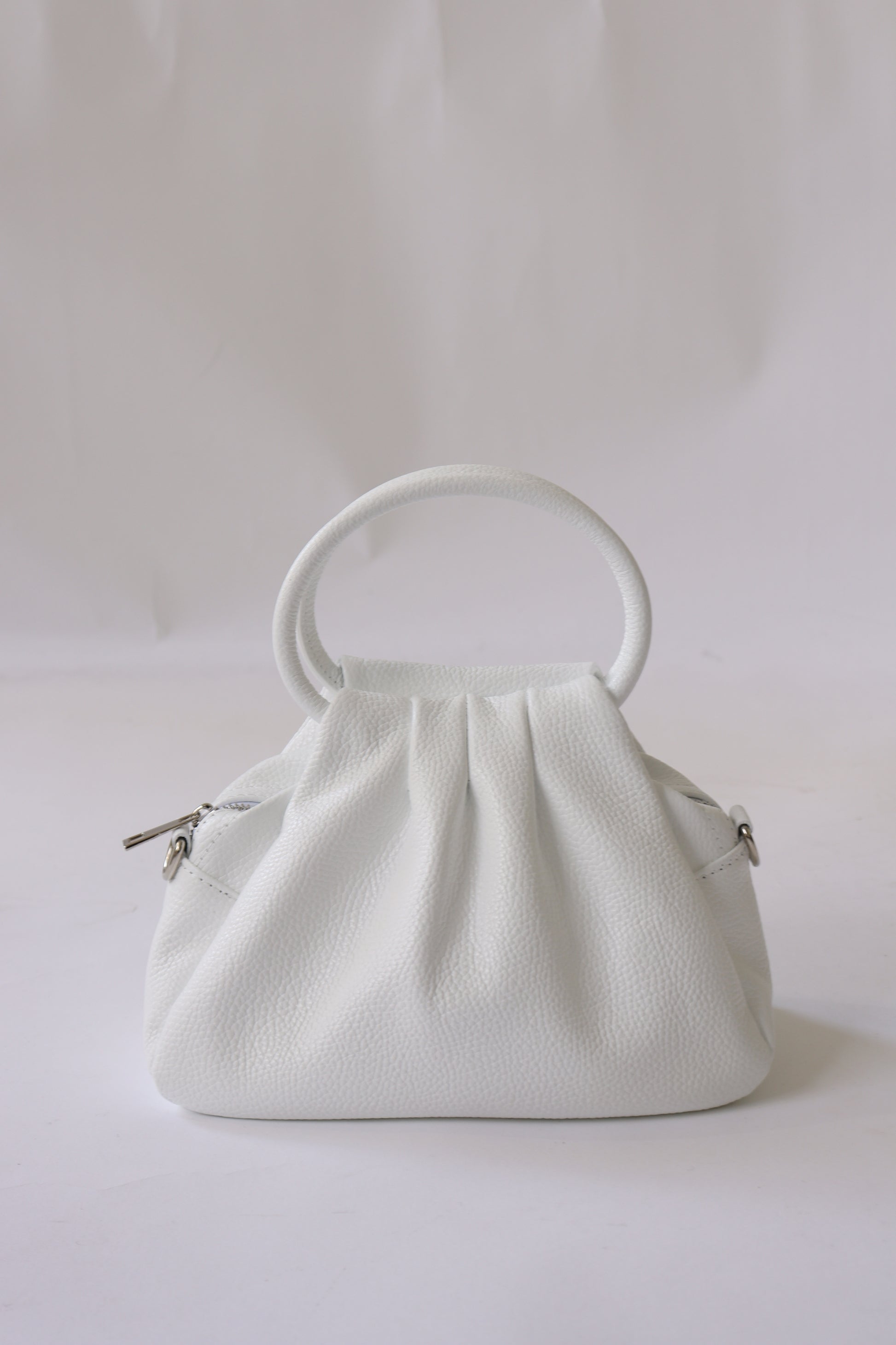 クラシックなタックを取り入れたなハンドバッグ。ふっくらとした丸みが特徴的な美しいフォルム。ファスナーとマグネット付きでしっかりと口が閉まるタイプ。