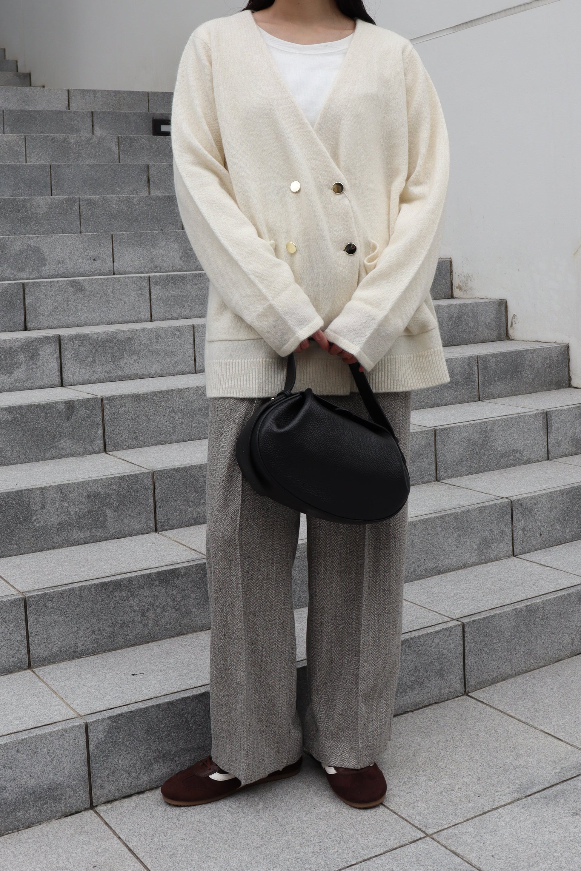 タックを入れて立体感を出し、荷物の量にかかわらずきれいなフォルムがでるようデザインされています。ハンドベルトは留め方を調節し、長さを調整できます。取り外し可能なロングストラップ付。遊び心のある大人かわいいアイテムです。