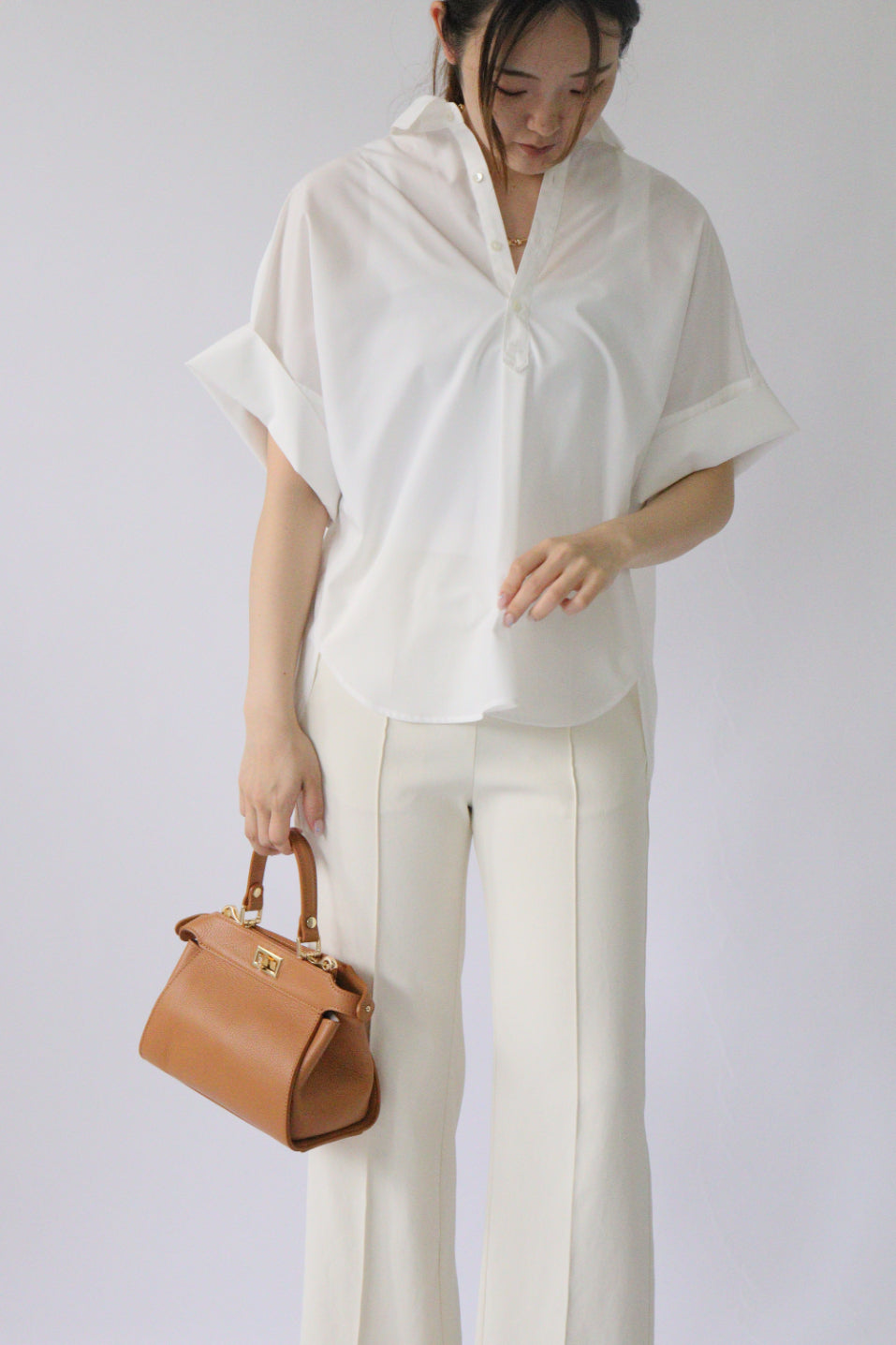 後ろ衿部分にはフェイクパールボタンをあしらい、さりげなくレディな印象に。身幅をたっぷりととったワイドなシルエットが着ると華奢に見せてくれます。ヘンリーネックのようなフロントの開きデザイン、太幅の折り返し可能なカフスなどディティールに凝った1枚。
