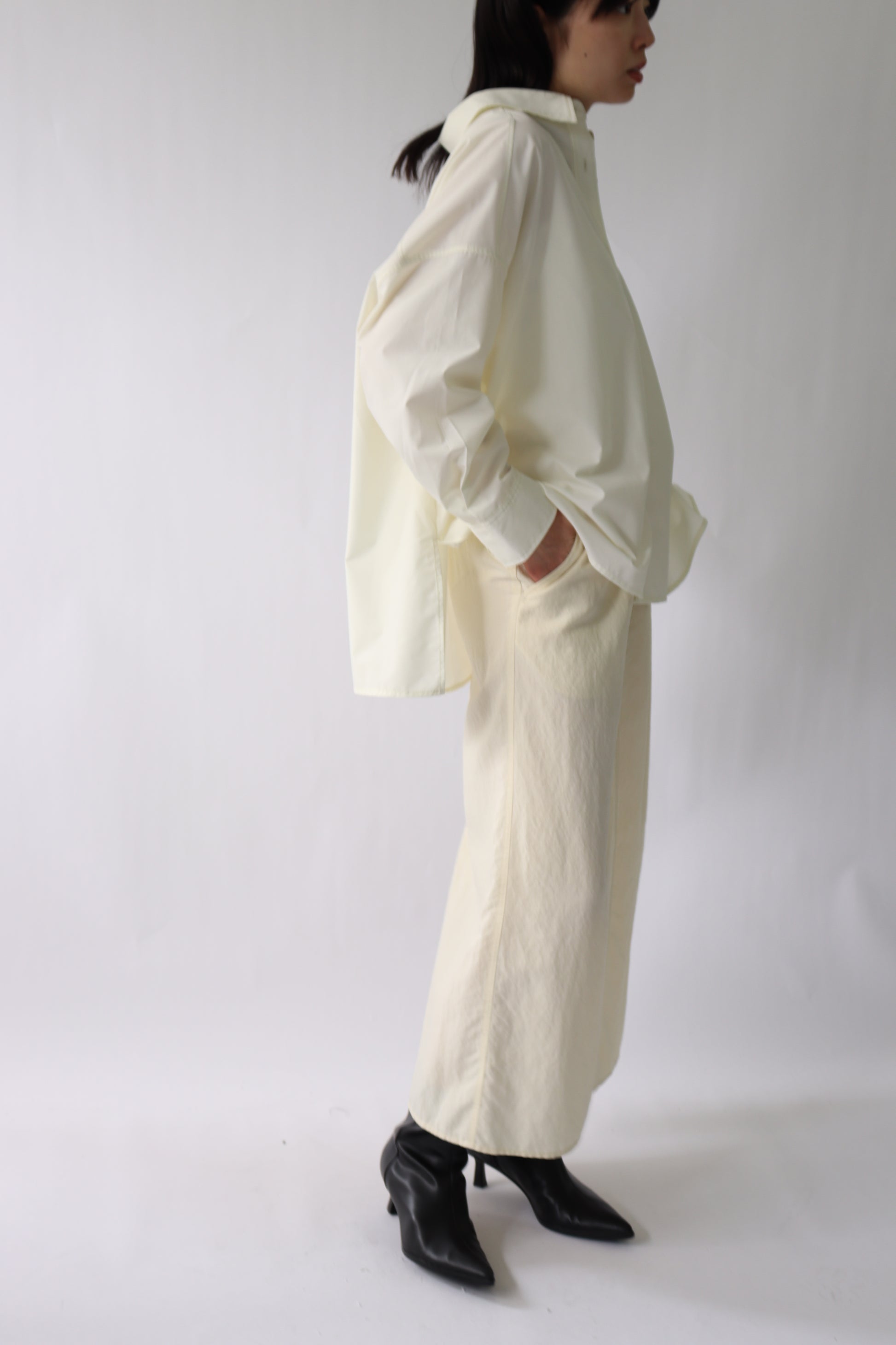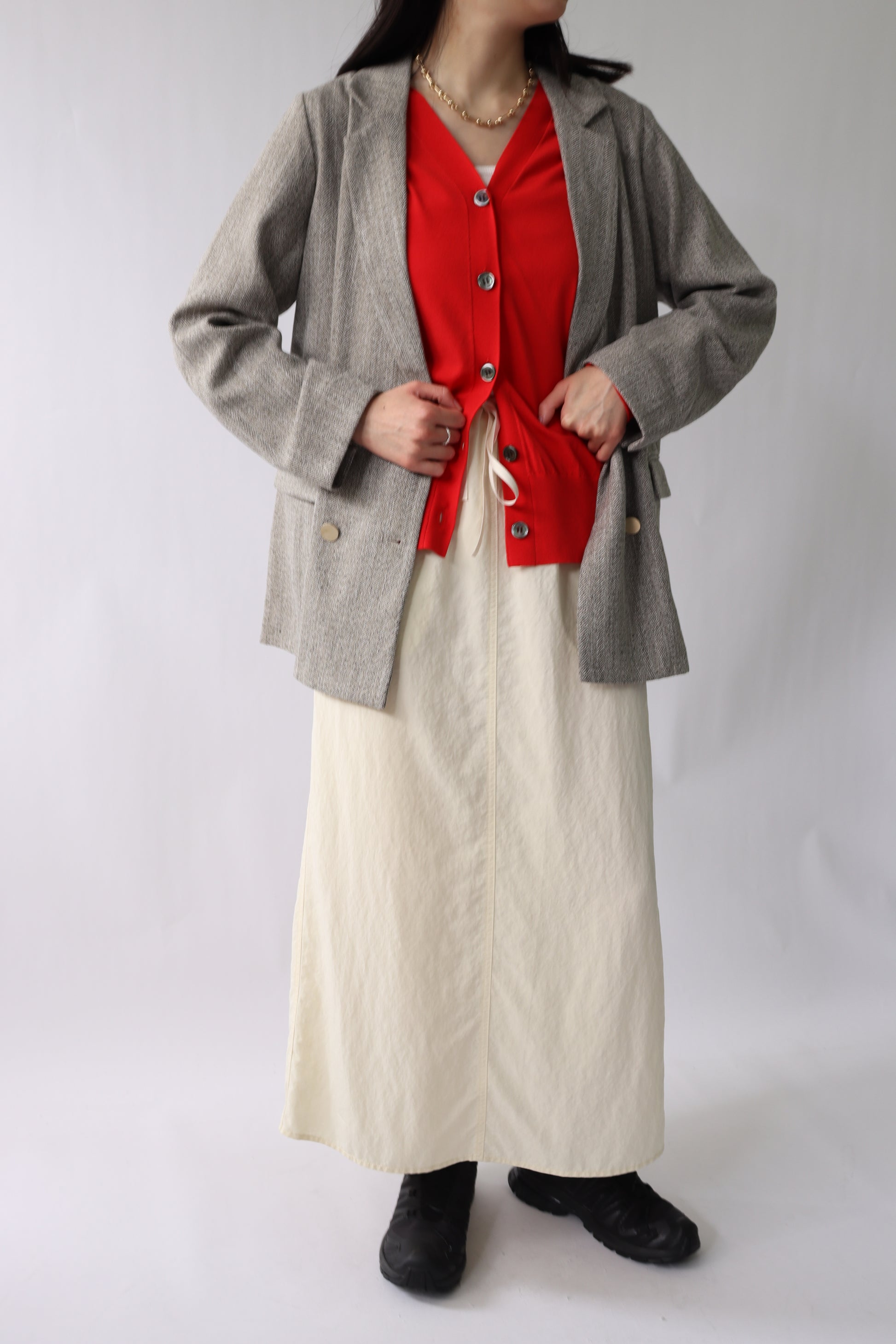 ヴィンテージ感と微光沢がカジュアル過ぎない大人ポイント。ウエストはぐるりとゴム入りで、フロントの紐はスエード調でポイントに。